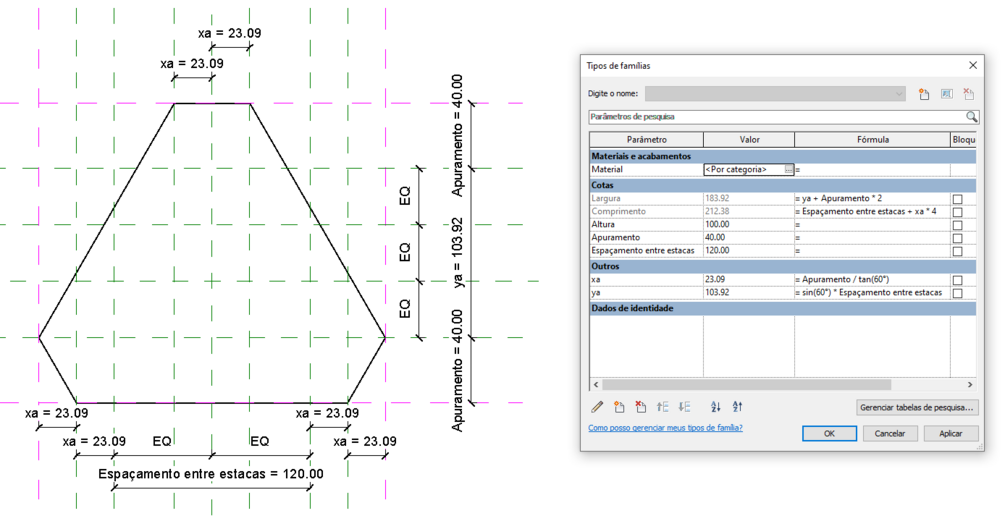 Duas famílias de blocos de fundação triangular para o Revit, versão 2019, apesar do Revit já trazer blocos triangulares, usualmente as dimensões do bloco são definidas pela dimensão da estaca até a face (diâmetro da estaca) e o espaçamento entre estacas (3*diâmetro da estaca). Com isto criei esta família onde largura e comprimento são calculados automaticamente a partir de dois parâmetros, "Apuramento" que é a distância da estaca até a face e o "Espaçamento entre estacas". Também criei uma família com cálice que é definido a partir do tamanho do pilar, e também é possível definir um deslocamento do cálice a partir do centro.